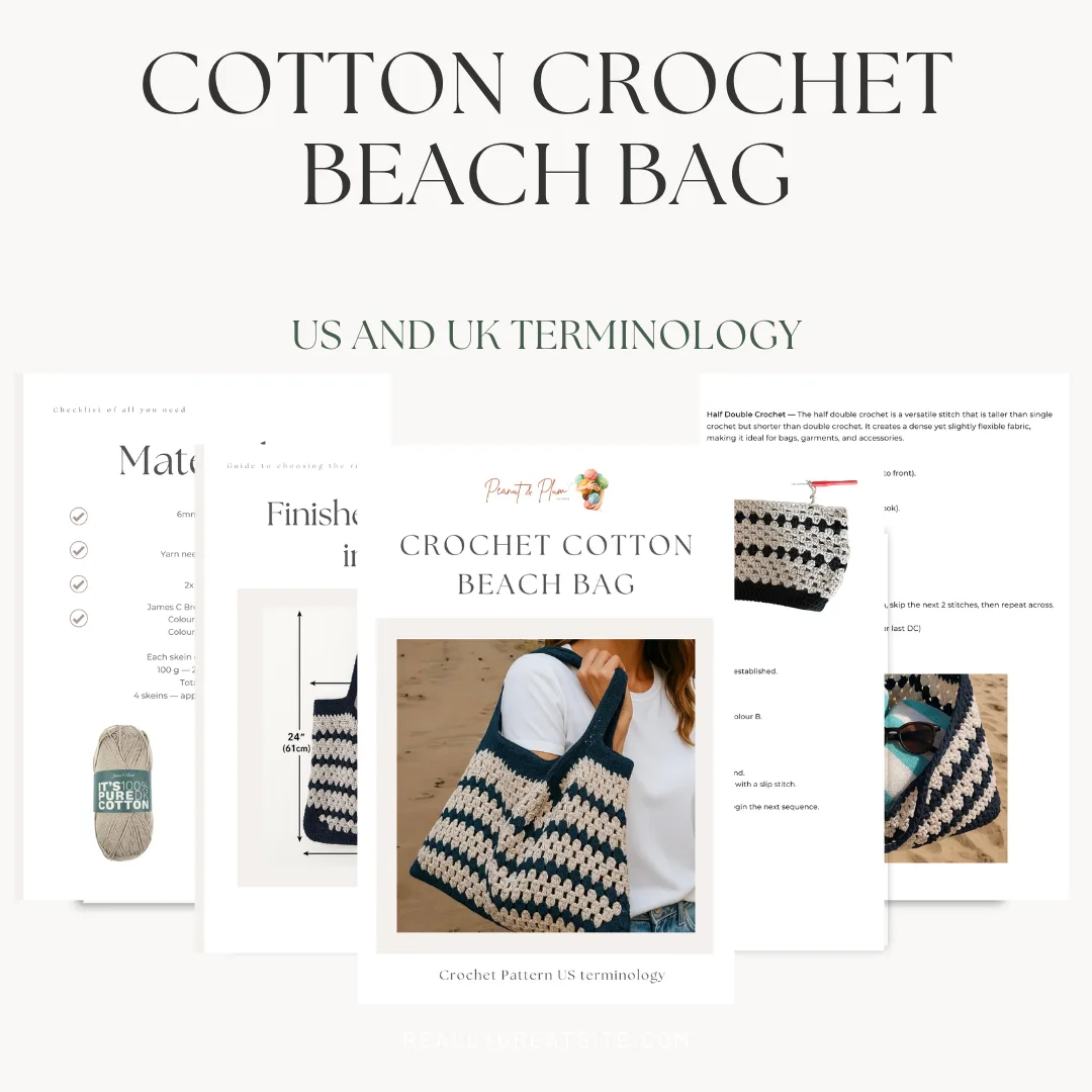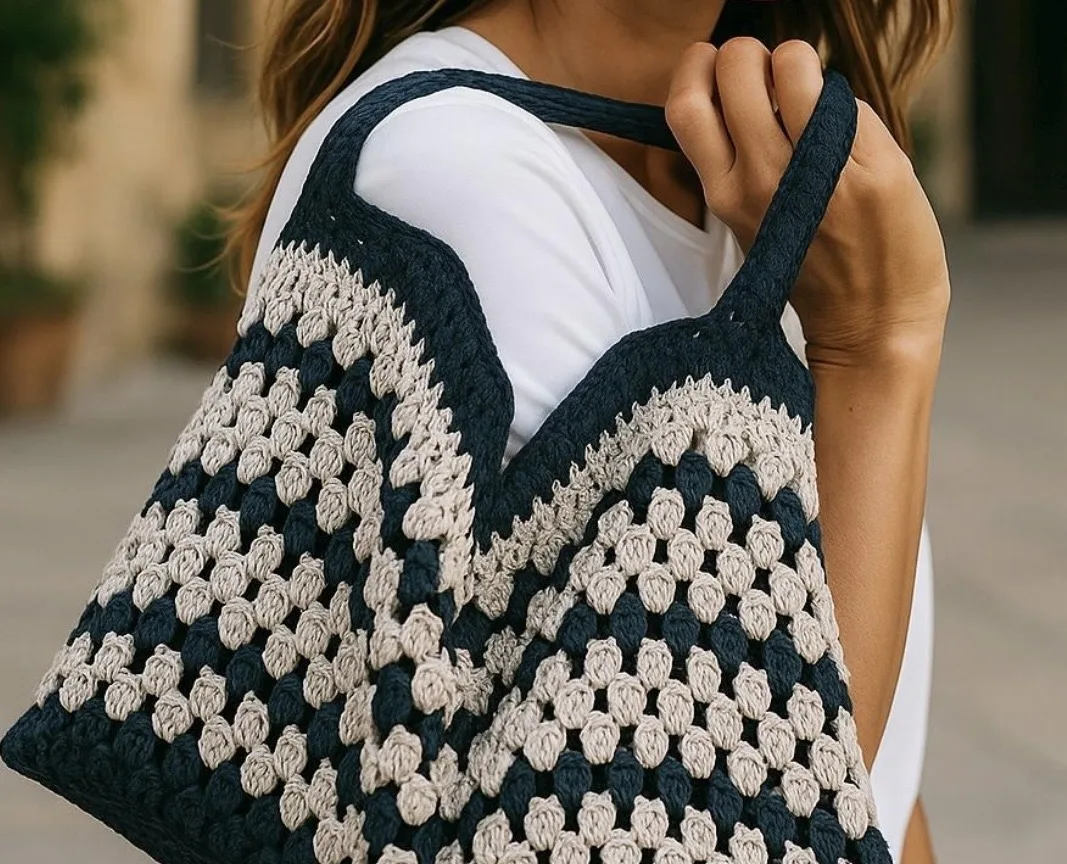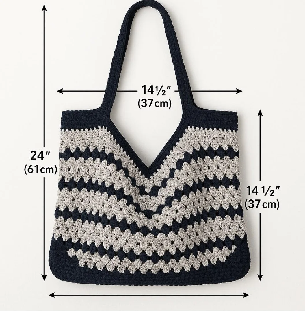 Made with 100% pure cotton DK yarn (James C Brett) in Black and Sand, it’s durable, breathable, and designed to stretch — comfortably fitting two beach towels plus all your seaside essentials.